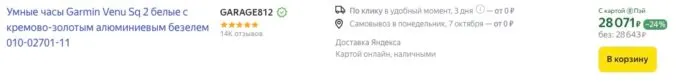 Несколько месяцев прайс на эту модель уверенно держался на отметке в 40 косарей, но сейчас на Яндекс Маркете стильные часы Garmin Venu Sq 2 можно урвать за 28 643 рубля. А с кэшбеками некоторых банков они обойдутся ещё дешевле.