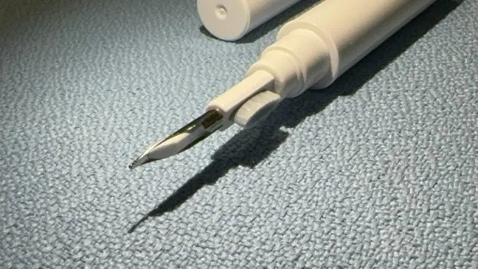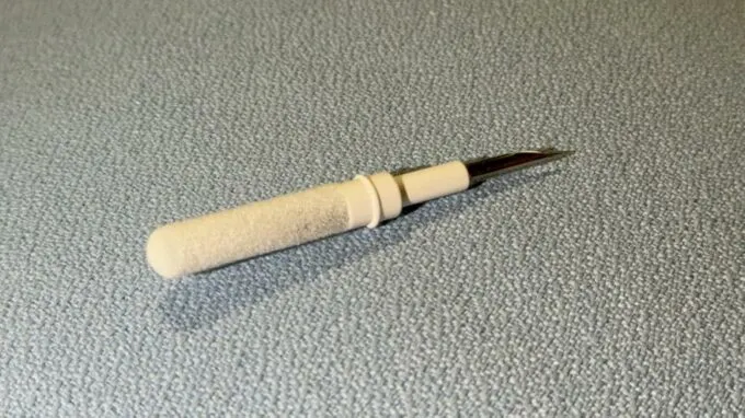 Эта штука имеет форм-фактор ручки, закрытой колпачками с двух сторон. С одной стороны находится металлическое перо для того, чтобы вытаскивать и вытягивать крупные фрагменты пыли. Также под острием есть небольшая щетка. С другой стороны разместили мягкий наконечник с плотными ворсинками — с его помощью можно чистить крупные детали или наводить финальный лоск.