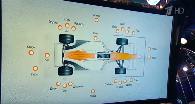 Вот правильный ответ. На самом деле речь идет об автогонках, а картинка представляет собой схему размещения механиков во время пит-стопа. «22 человека за четыре секунды справляются с техническим обслуживанием машины», – пояснил ведущий Борис Крюк, а капитан команды Денис Элькис назвал вопрос очень красивым.
