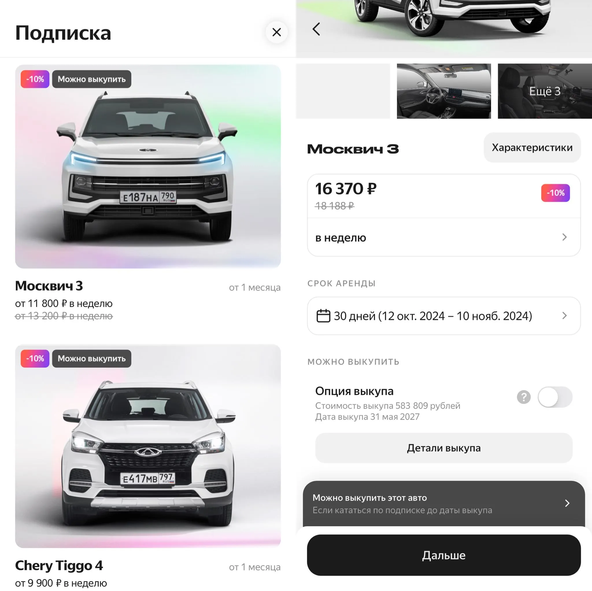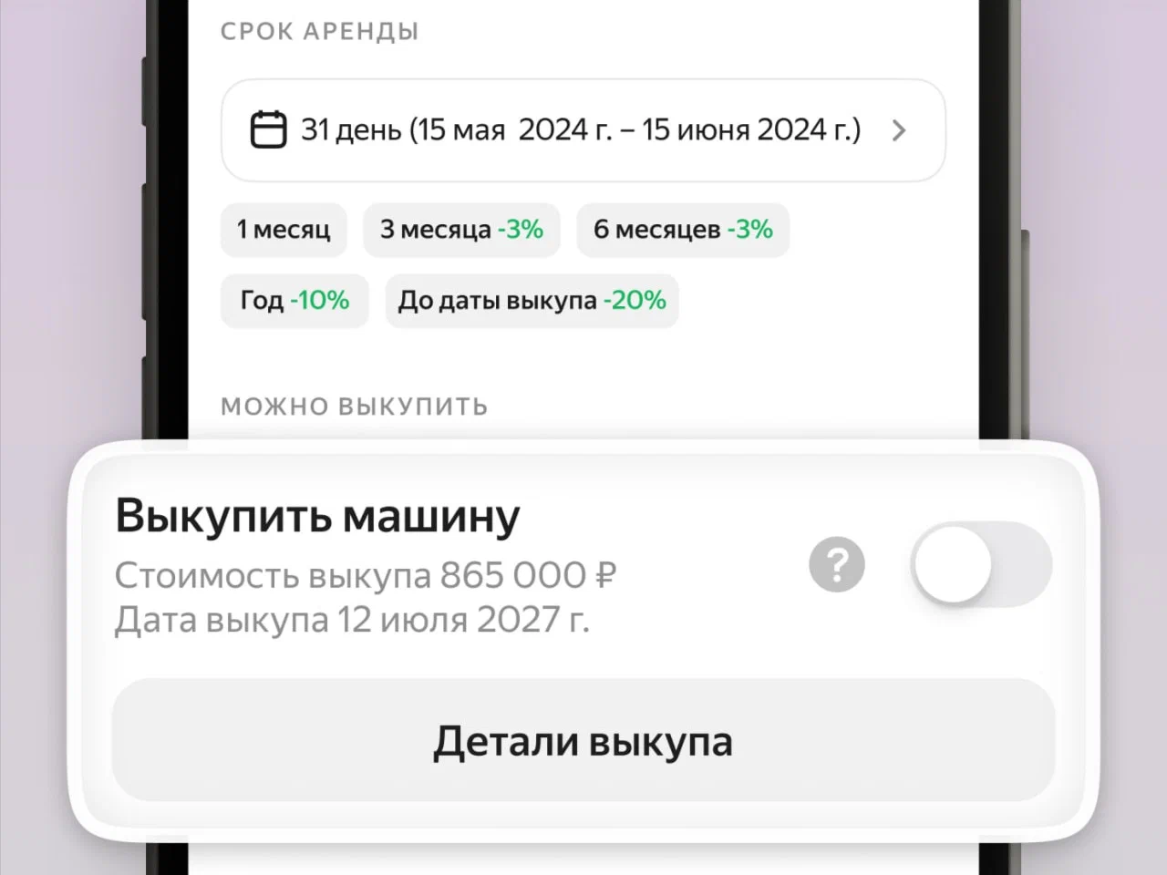 С октября 2020 года в «Драйве» есть возможность оформить долгосрочную аренду. Сейчас можно не только взять машину по подписке, но и оформить выкуп — платить небольшими частями, чтобы в конце забрать ее себе. Доступные для продажи автомобили можно найти в разделе «Подписка» — там есть и новые машины, которые еще не были в каршеринге. По договору пользователь будет платить не только сумму аренды, но и сумму выкупа.