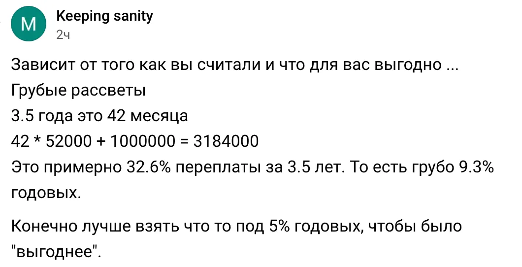 Разумеется, есть переплата. Так, при условиях выше человек заплатит за 3,5 года 3 184 000 рублей. То есть переплатит 784 000 рублей. Вот такая математика из комментариев на VC: