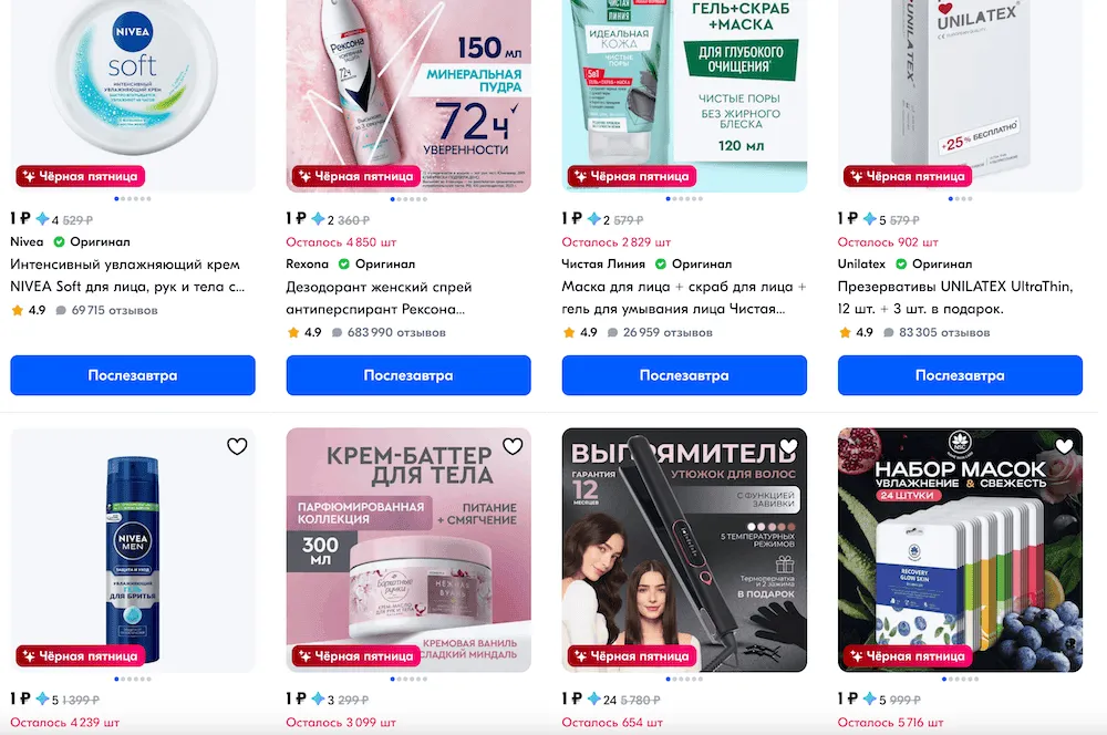 Еще на маркетплейсе есть «звездные товары», за покупку которых держатель карты получает бонусы (1 звезда за каждые потраченные 5000 рублей). Новые юзеры получают первые 10 звезд за каждые потраченные 2000 рублей. Накопленные звезды можно потратить на товары за 1 рубль — вот раздел с ними.