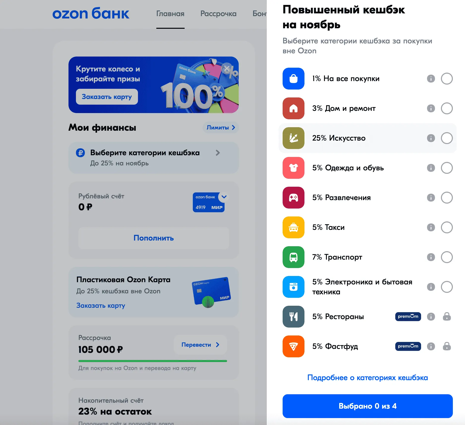 Кроме того, владельцы «Ozon Карты» могут рассчитывать на кэшбек. Каждый месяц можно выбрать 4 категории товаров, за приобретение которых будут возвращать денежки. В списке есть услуги и сервисы — например, «Такси» или «Развлечения».