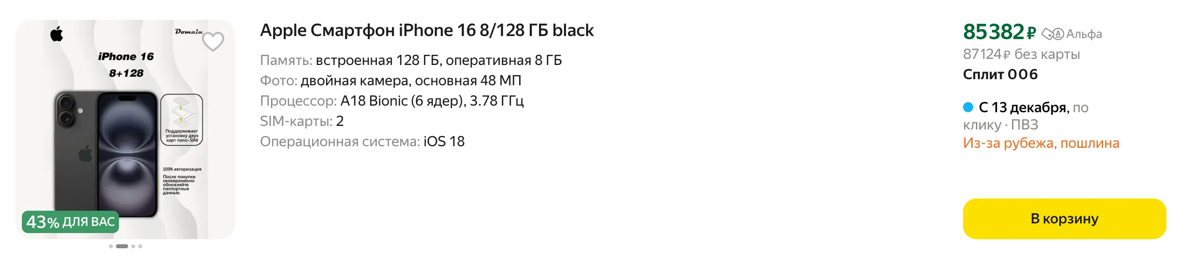 Что делать? Можно брать смартфон в России, но с тщательным мониторингом — чекайте отзывы продавца, убедитесь, что покупаете именно iPhone 16. Например, многие карточки с iPhone 15 или iPhone 14 на Маркете открываются по запросу «iPhone 16». Второй вариант — ждать снижения цен. Скорее всего, айфоны как минимум с доставкой из-за границы подешевеют, но неизвестно, когда это случится.