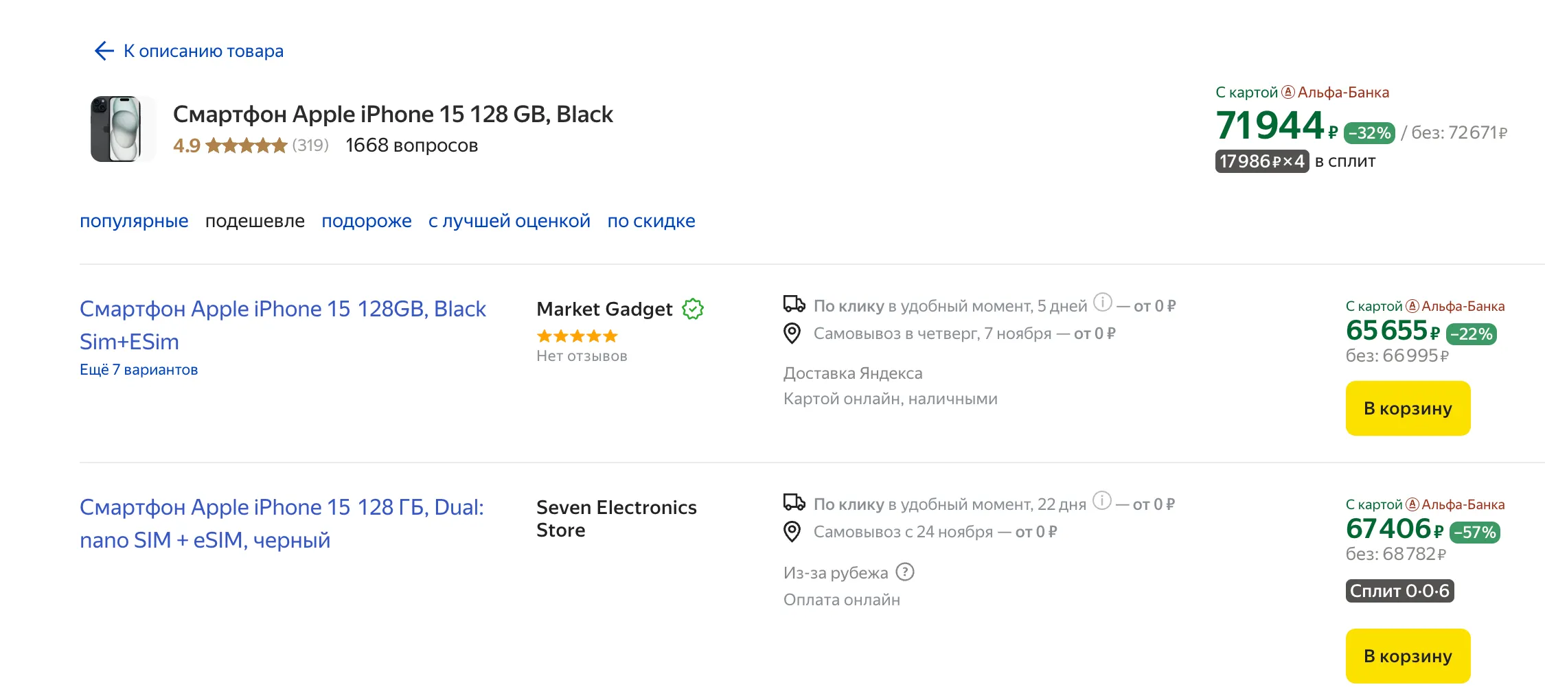 - iPhone 15 (128 Гбайт) — 72 200 рублей, прошлый месяц — 79 000 рублей