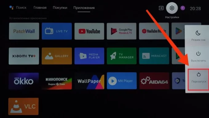 В первую очередь попробуйте перезагрузить телевизор — да, иногда такой тупой совет может помочь. Но ОС не всегда перезагружается, когда вы выключаете само устройство. Для ребута нужно задержать палец на кнопке выключения до появления меню с пунктом «Перезапуск».