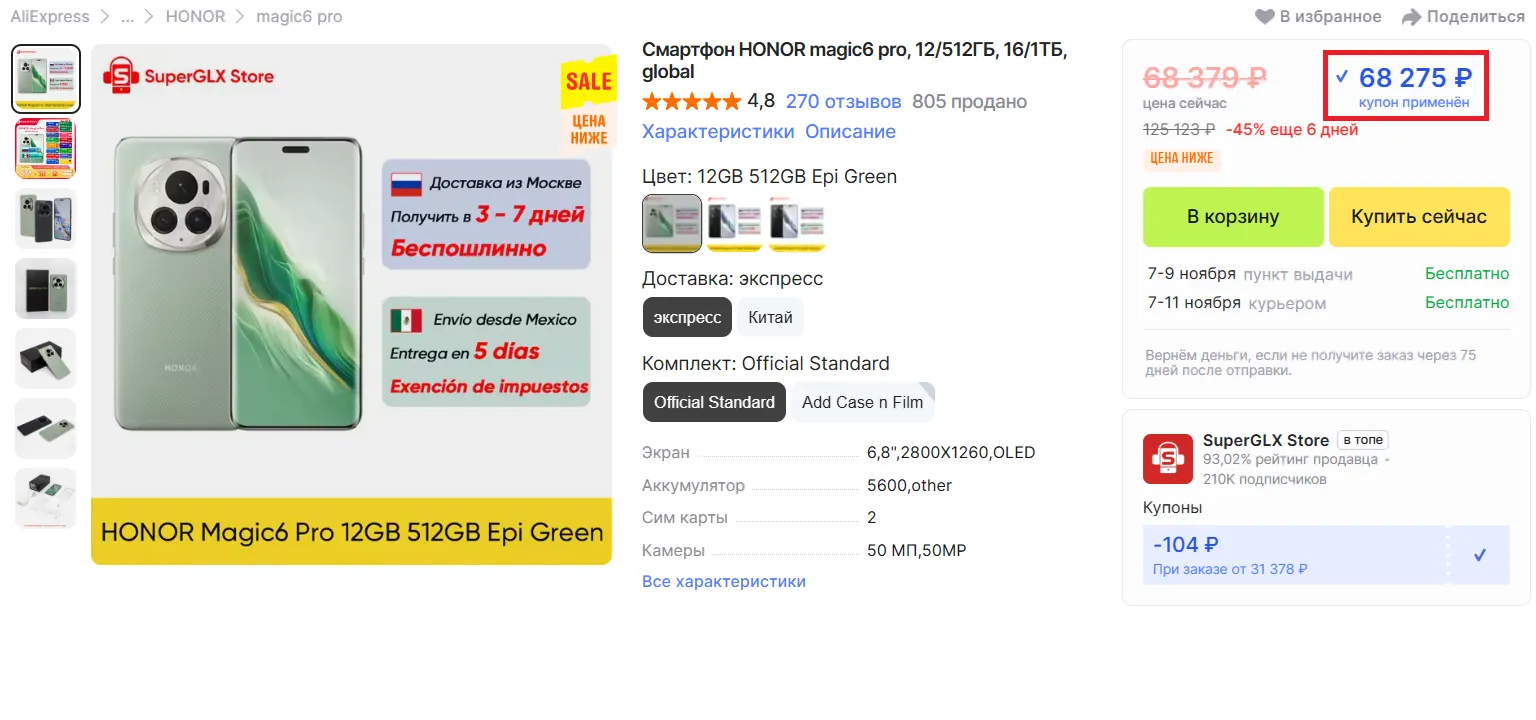 В России за смартфон просят минимум 85 кэсов, а на Али он доступен всего за 68 275 рублей, причем даже пошлину платить не придется.