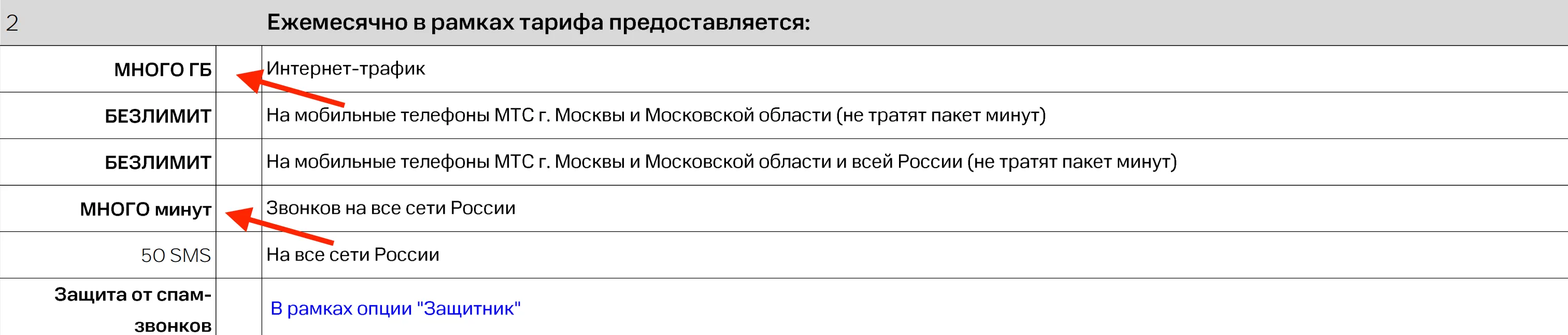 Также в «Супер МТС» входят безлимитные звонки в сети МТС и 1200 минут на звонки на номера других операторов, 50 SMS и «много» гигабайт интернета. Это не шутка, а термин из договора — под понятием «много» МТС подразумевает 50 Гбайт.