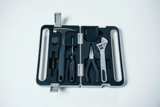 Сам кейс сделан из приятного на ощупь матового серого пластика. Внутри встречают: молоток с гвоздодёром и дополнительной резиновой головкой, отвёртка с комплектом на 10 бит и удлинителем, многофункциональные острогубцы, а еще рулетка на 3 метра и разводной ключ. Такого разнообразия инструментов хватит на все случаи жизни.
