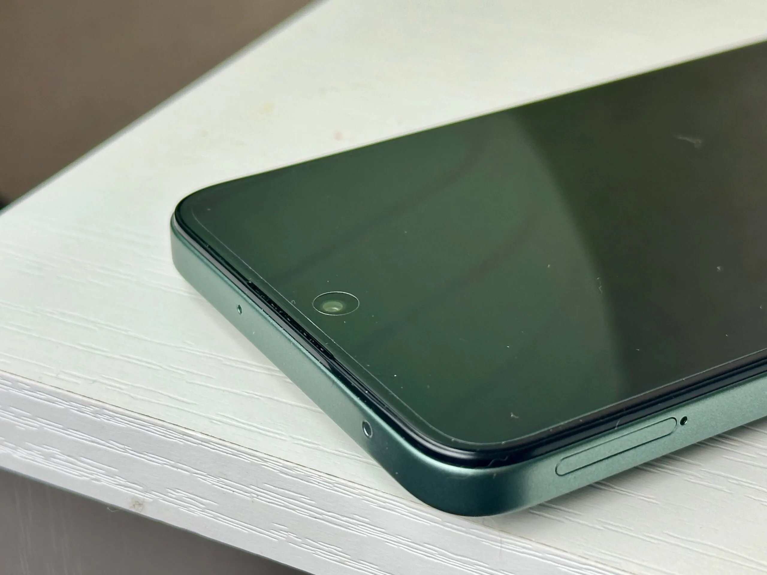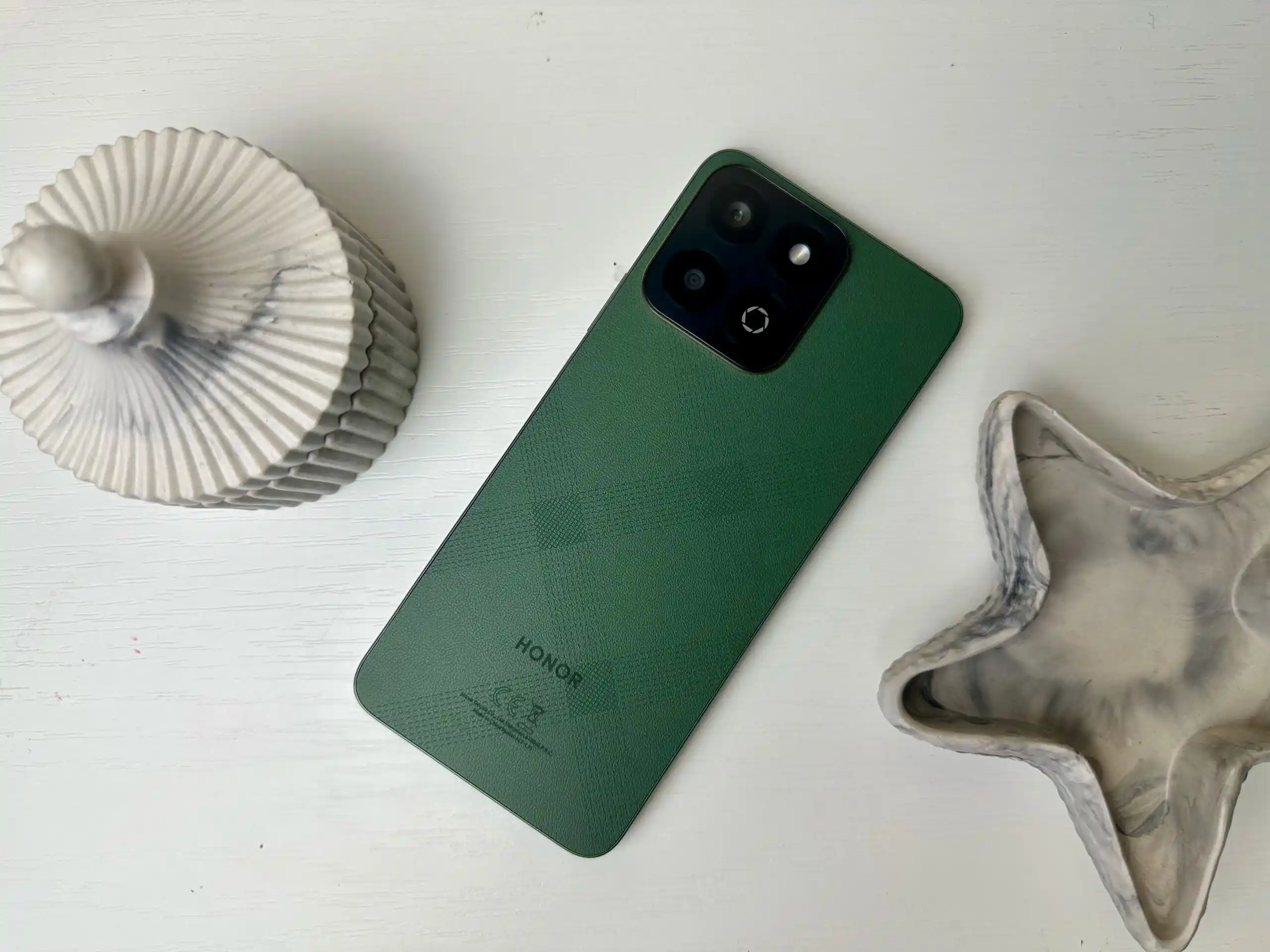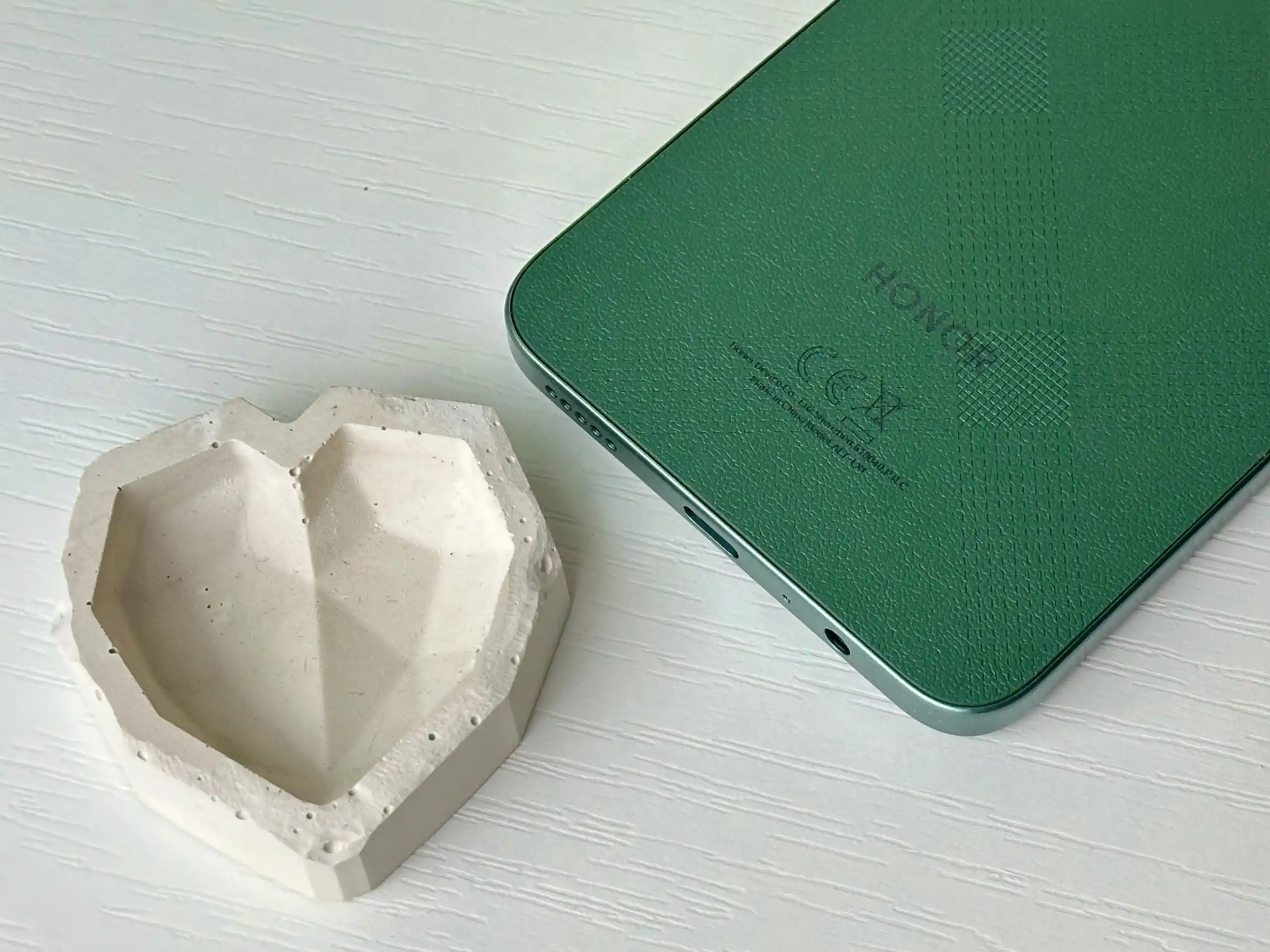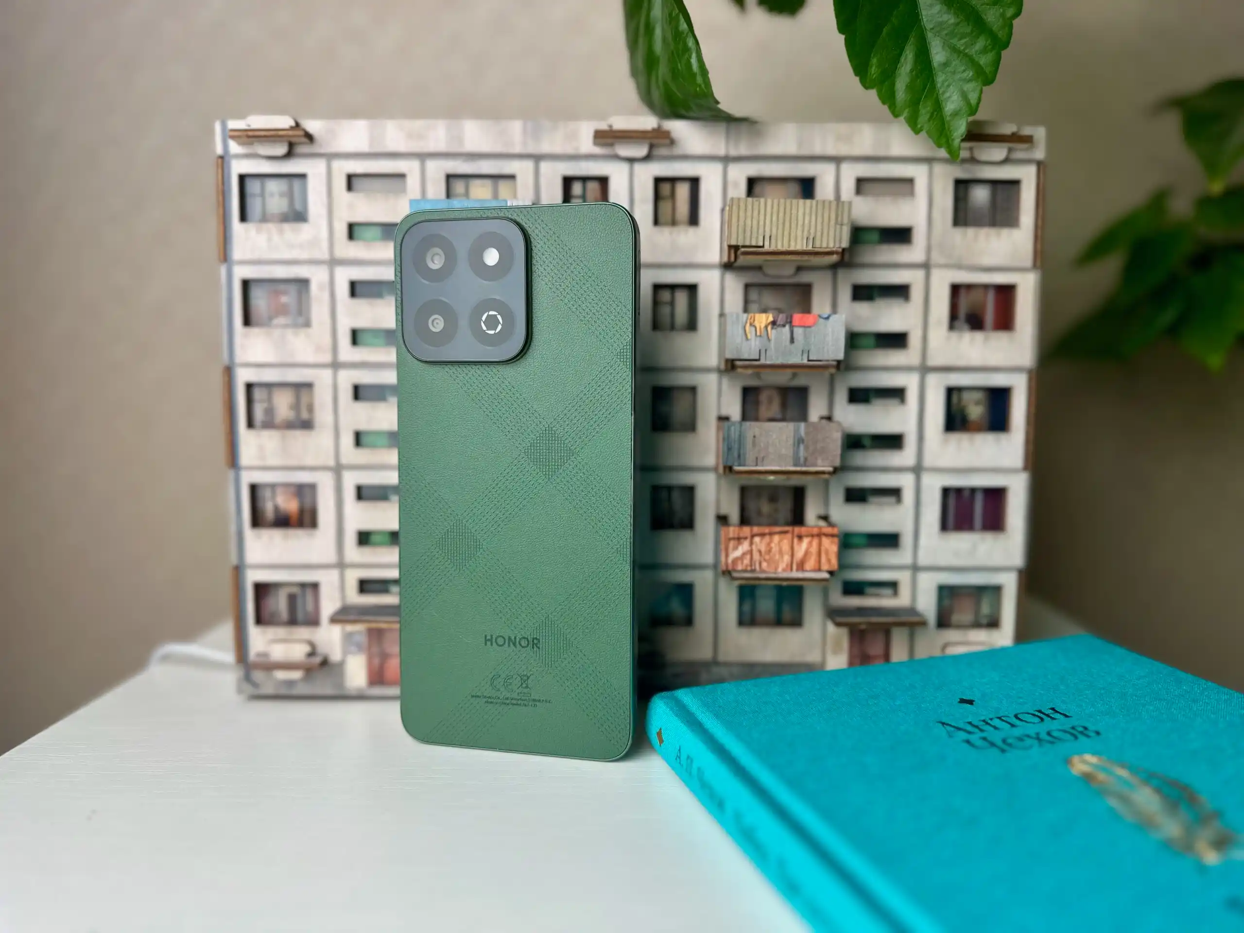 Смартфон имеет размеры 166,9 х 76,8 х 8,1 мм и вес 196 граммов. Разница с моим iPhone 14 Pro Max небольшая (40 граммов), но устройство от Honor кажется невесомым и почти не чувствуется в кармане куртки. Держать его очень удобно. На выбор есть три варианта — черный, зеленый с закосом под кожу и белый с имитацией мрамора. У меня оказался очень стильный зеленый телефон. Задняя панель изготовлена из мягкого пластика с тиснением.