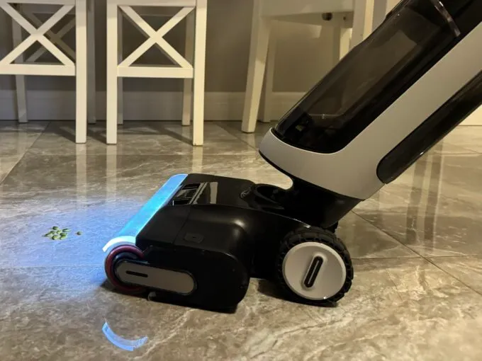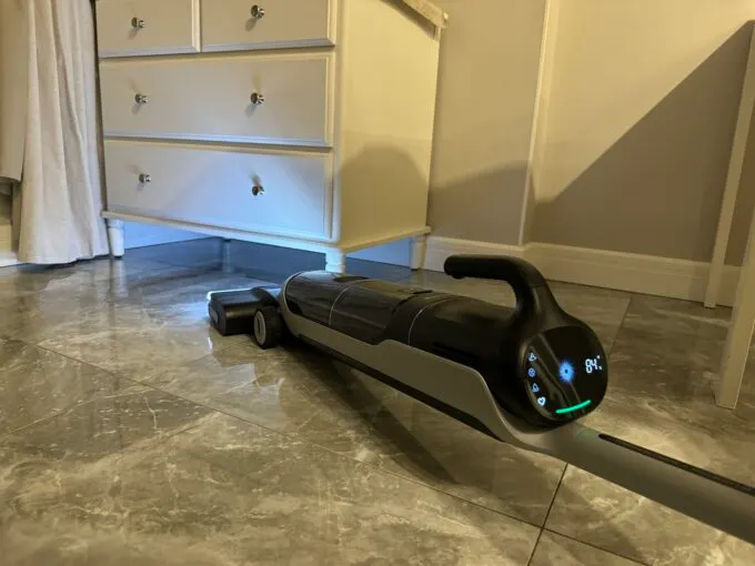 4. Мойка пола в горизонтальном положении. Механизм позволяет опустить рукоятку параллельно полу, чтобы пролезть под условную тумбу или комод. То есть там, где раньше приходилось драить руками, теперь легко можно просто пройтись с помощью Dreame H14 Dual. Высота пылесоса в таком режиме всего 14 сантиметров. Это правда очень удобно.