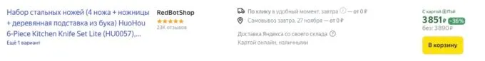 Прямо сейчас на Яндекс Маркете шикарный комплект ножей Xiaomi HuoHou Kitchen Steel Knife Set можно купить за 3890 рублей. А с кэшбеком некоторых банков вы сэкономите ещё несколько сотен рублей.