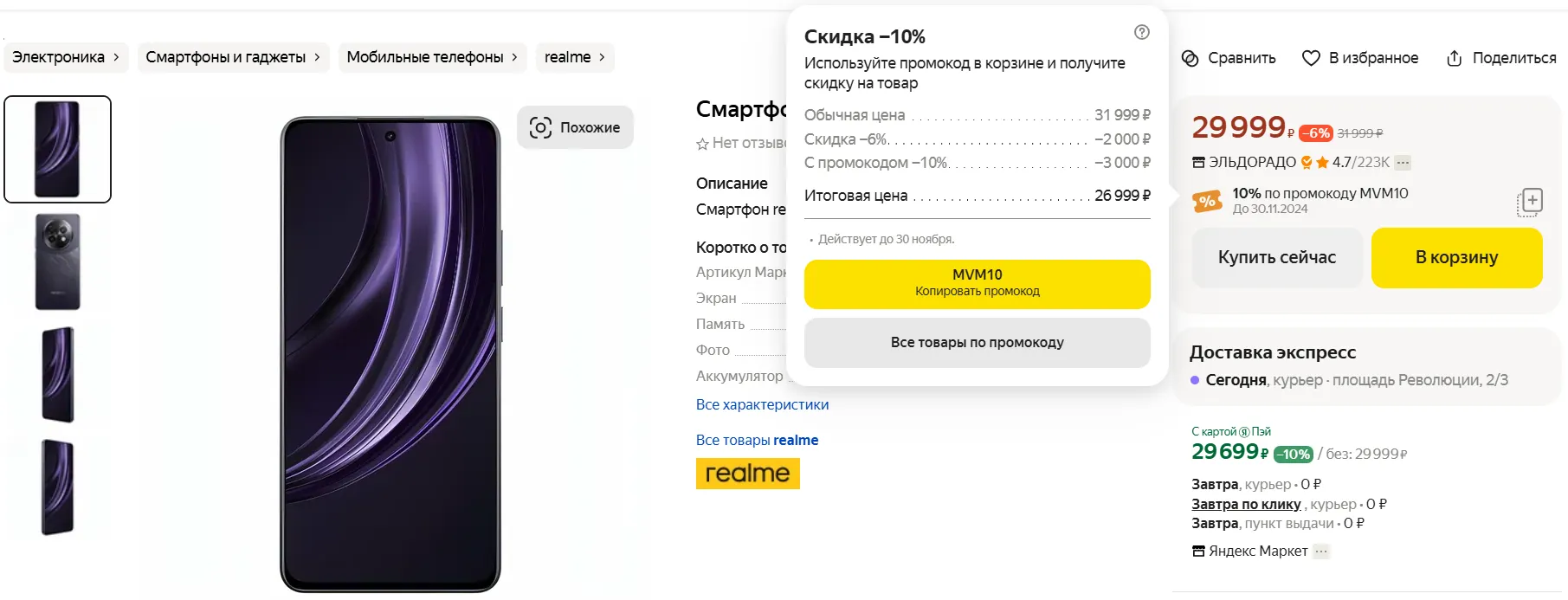 Официально за смарт просят 29 990 рублей, однако на Маркете его уже можно забрать за 27 кэсов — нужно лишь применить код MVM010, оформляя заказ у продавца «Эльдорадо». Если Realme 13+ вам зашел, отговаривать от покупки не будем: он не ужасен.