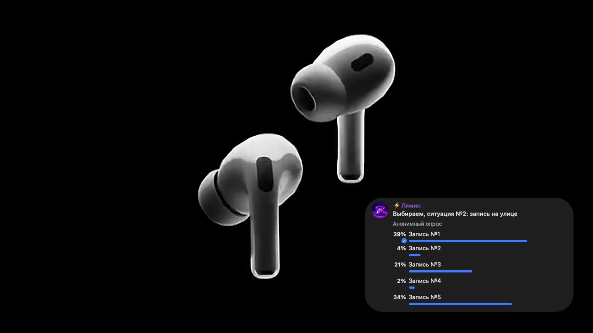 В домашней записи победил вариант 3 — за него отдали 64% голосов. По словам Лямина, он тоже проголосовал за этот вариант, так как запись понравилась ему больше всего с точки зрения детализации и четкости. И… победили AirPods Pro 2!
