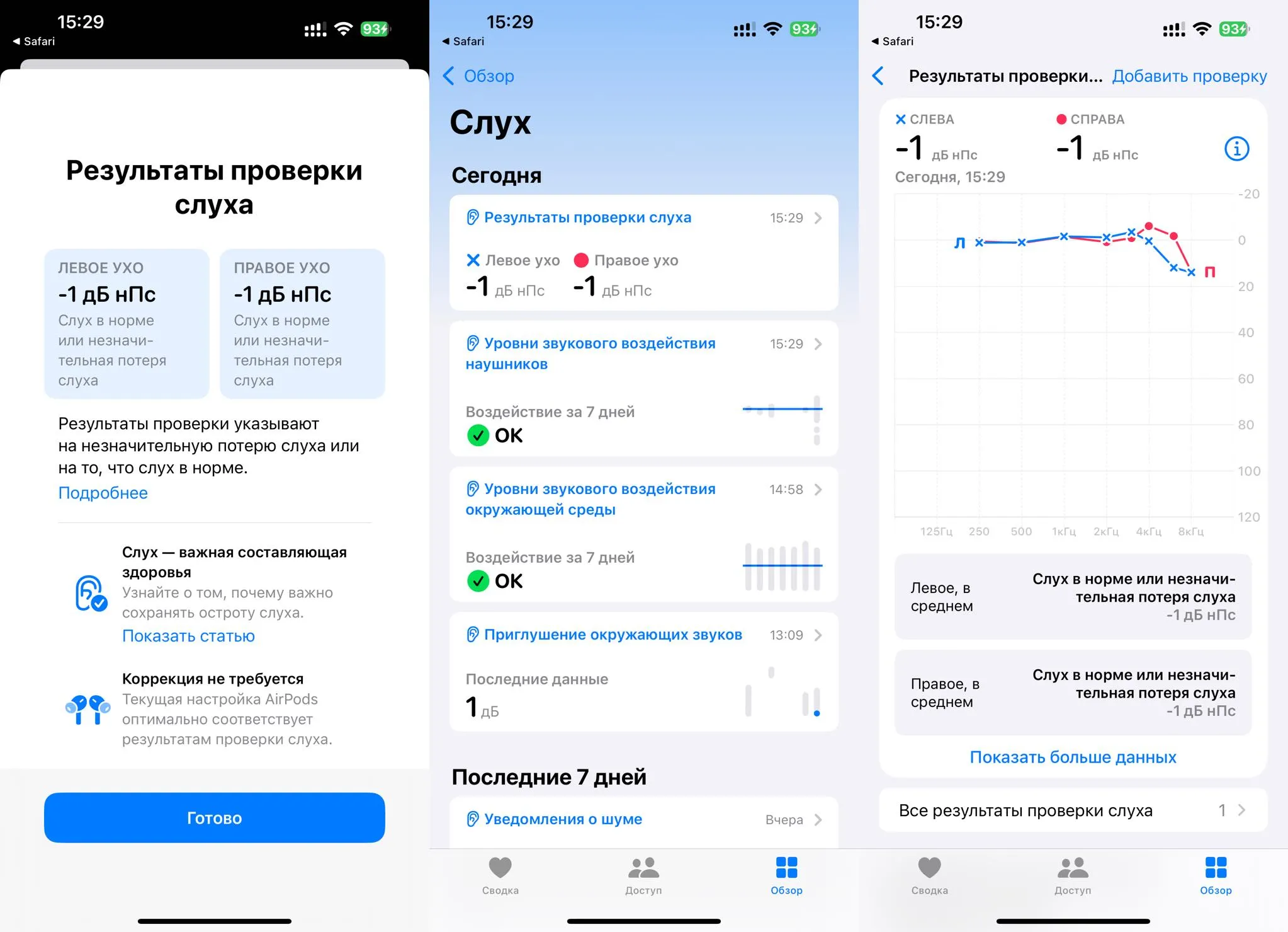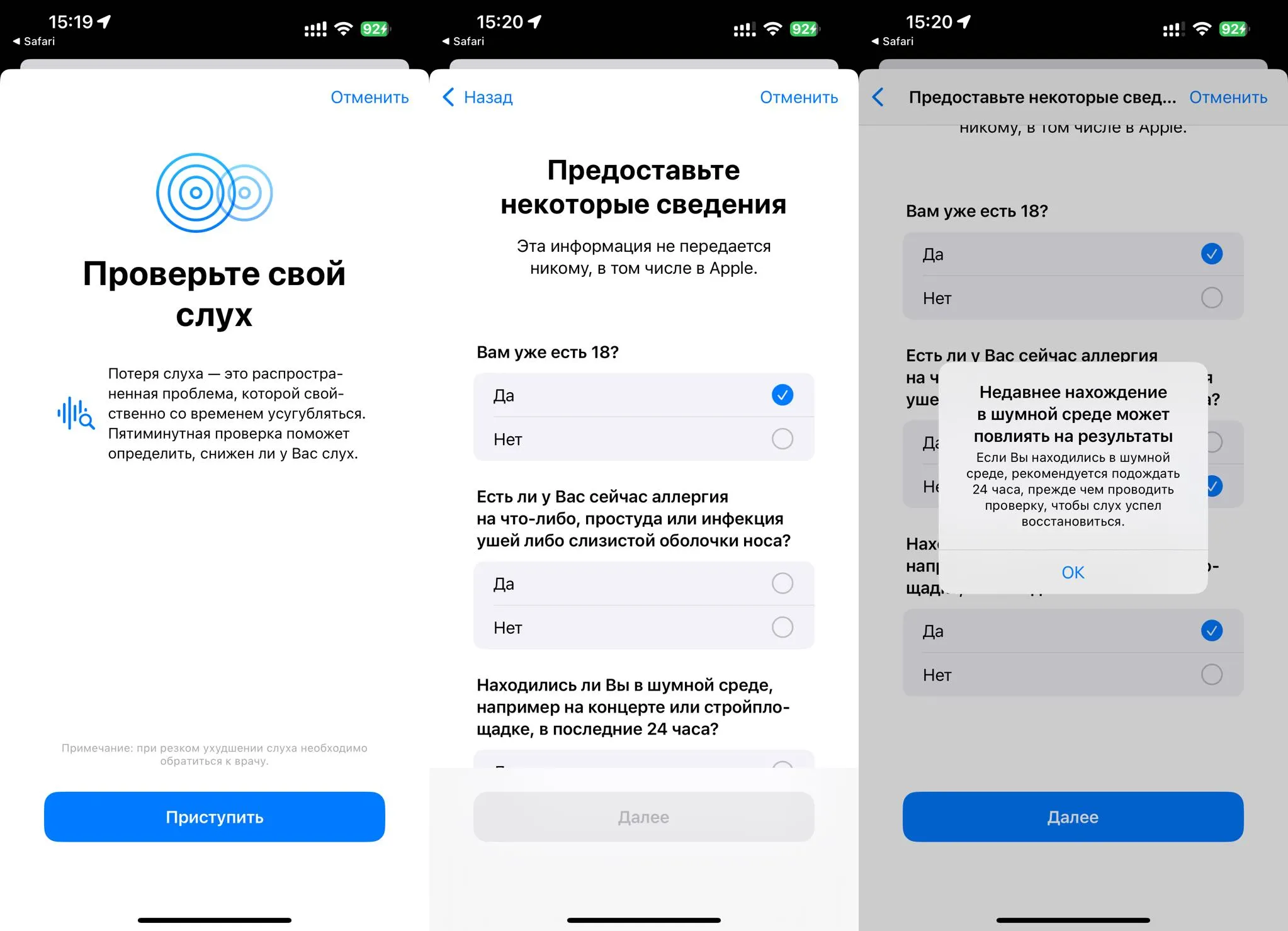 Смартфон перекинет нас в приложение «Здоровье», где iOS предложит пройти короткий тест. Кстати, интерфейс полностью русифицирован. Если вы были в шумной среде менее суток назад, то система предложит отложить тестирование на другой день.