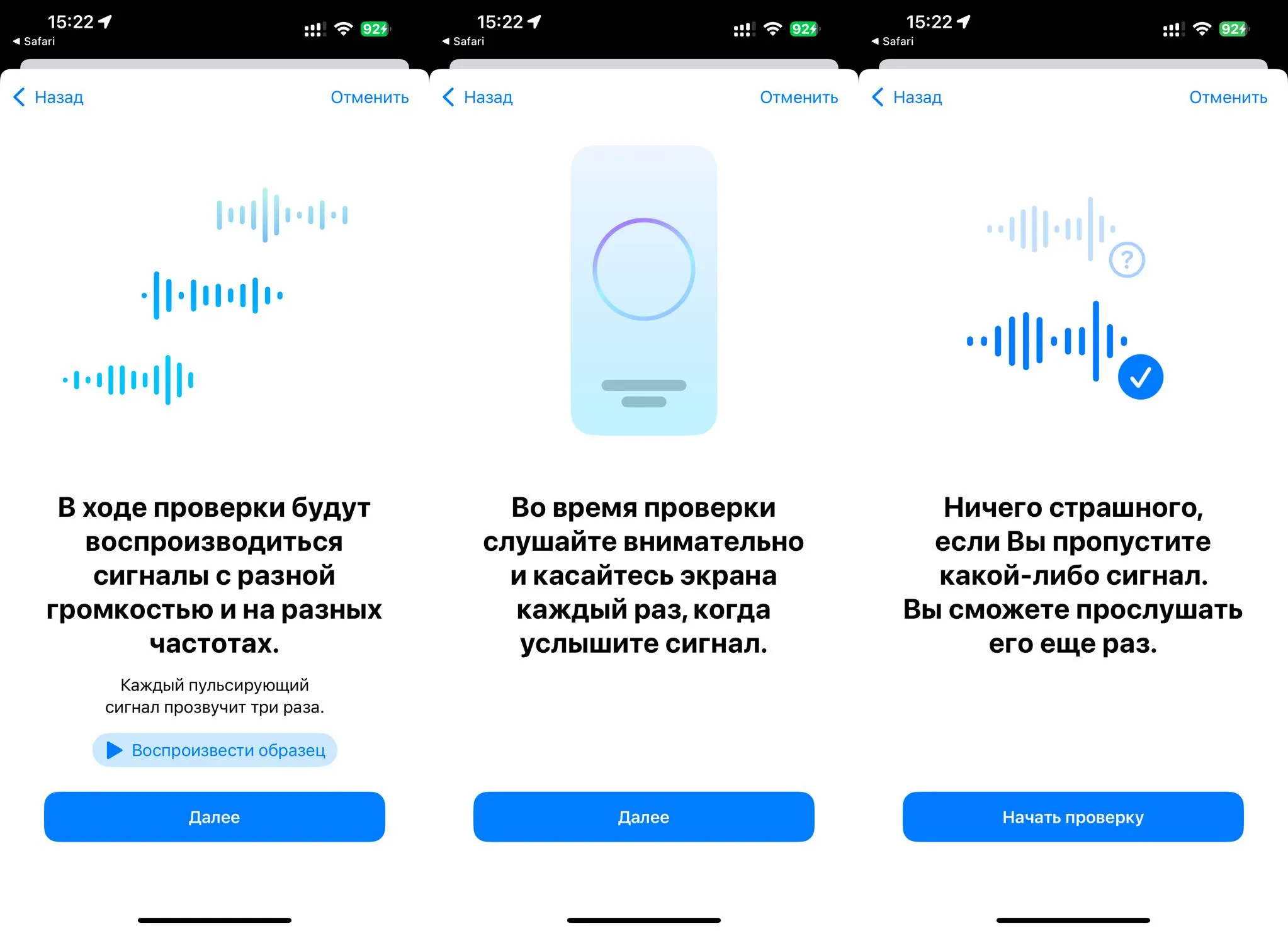 Далее Apple объяснит, что в течение нескольких минут телефон будет воспроизводить различные звуки. От нас требуется тапать на экран каждый раз, когда мы их услышим. Звуки напоминают сеанс радиосвязи или писк погрузчика в магазине — «пи-пи-пи» ни с чем не перепутаешь.