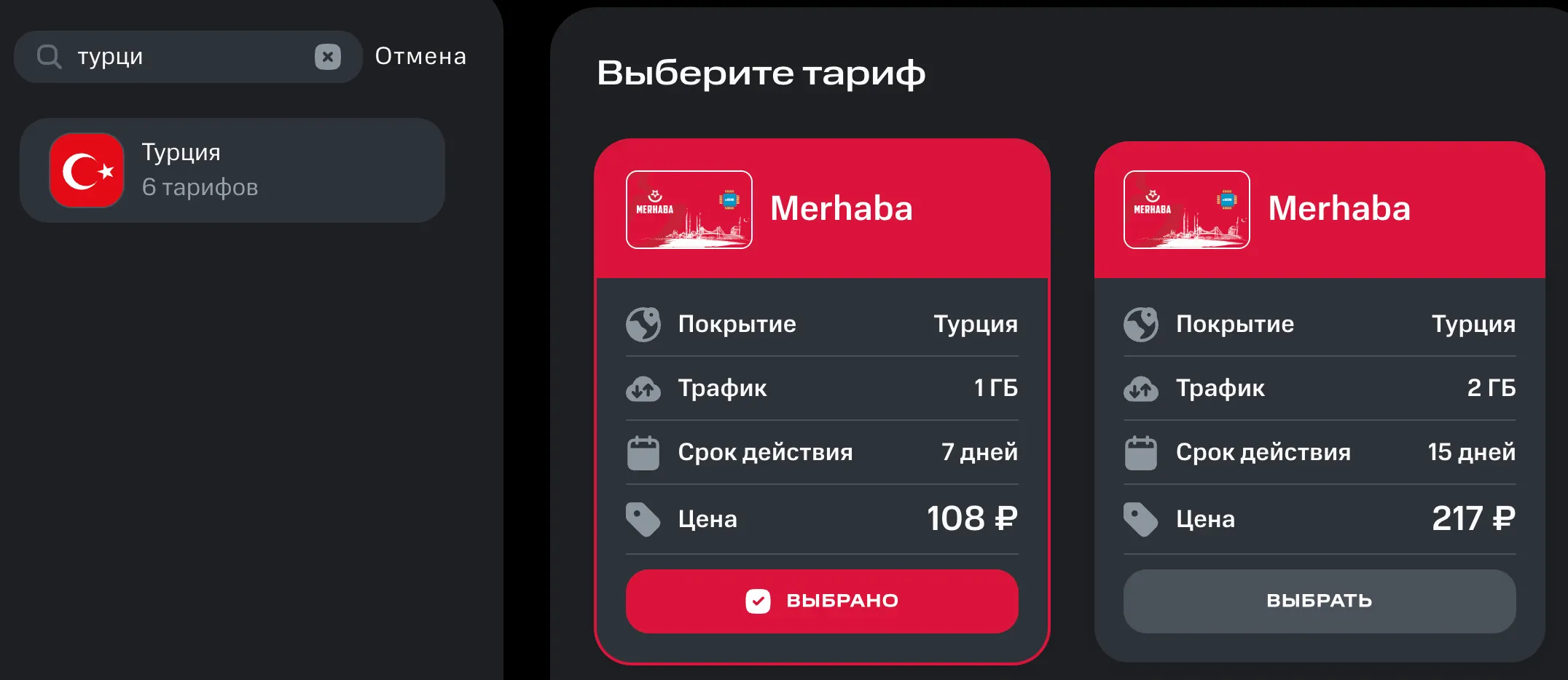 Посмотрим, сколько стоят тарифы? В Турции — одно из самых популярных направлений для путешественников — eSIM обойдется минимум в 108 рублей на неделю. В тариф входит 1 Гбайт — это ничтожно для России, но должно хватить, чтобы несколько раз проверить почту и ответить на сообщения в мессенджерах. Есть и жирный вариант — 20 Гбайт трафика на 30 дней стоимостью 1300 рублей.
