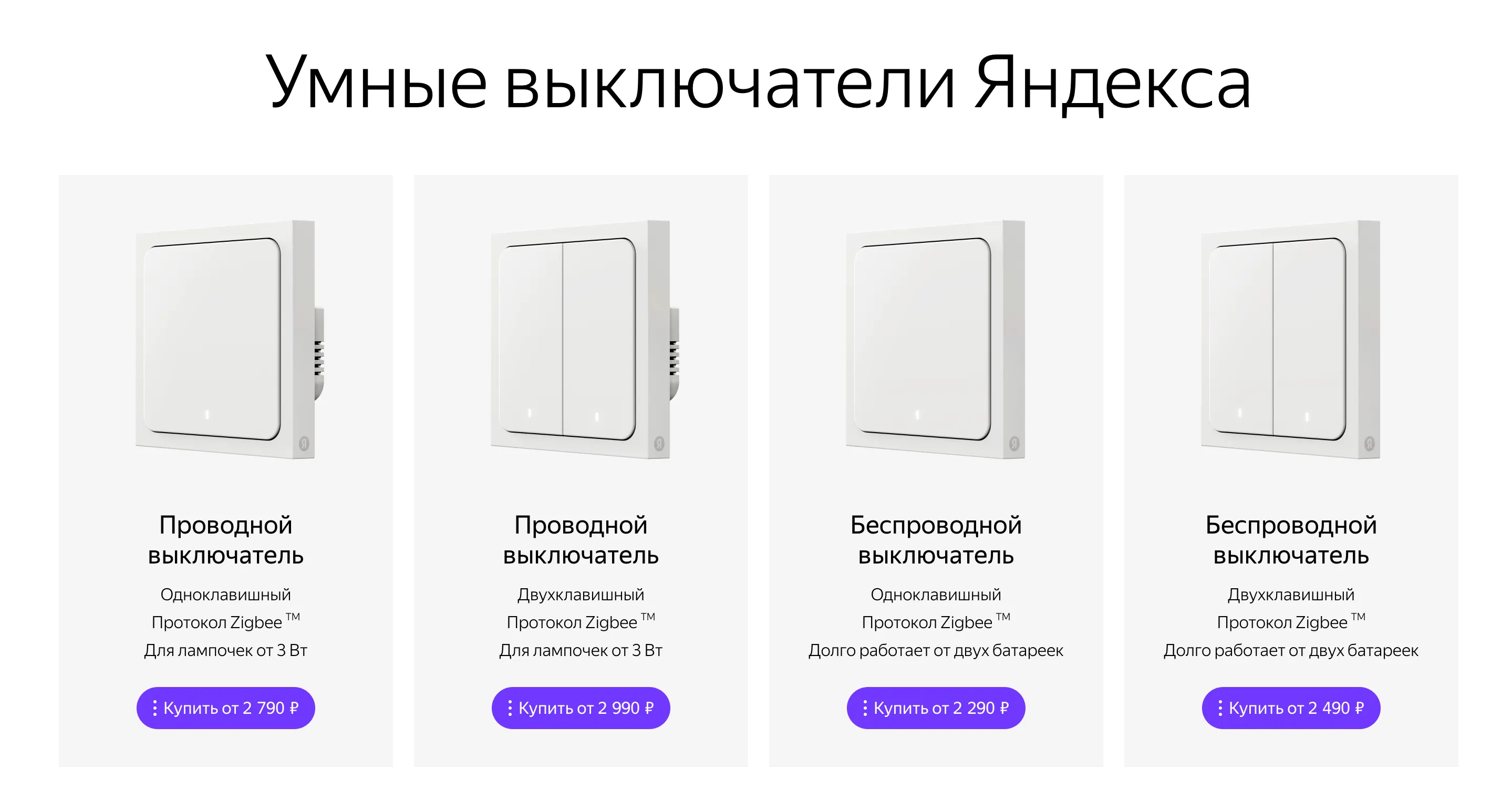 В линейку попали два выключателя — проводной и беспроводной. На них можно повесить опции управления светом или настроить любые команды, которые поддерживает «Алиса» и «Яндекс Станция». Например, запуск робота-пылесоса по нажатию или включение трека «Говновоз». Почему нет? Выключатели есть с одной или двумя кнопками, ценник стартует с 2290 рублей. Беспроводные модели работают на батарейке, которой хватит минимум на год.