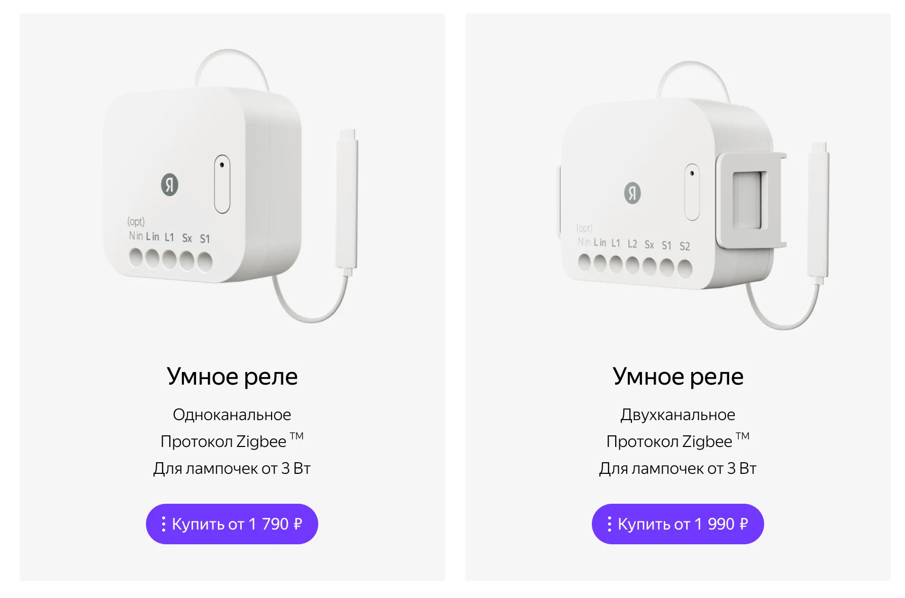 Умное реле — это альтернатива выключателю. Оно ставится в подрозетник за обычным выключателем или вместо него. С реле можно будет выключать свет как вручную, по старинке нажимая на кнопку, так и голосом или через сценарий умного дома. Девайсы работают по стандарту Zigbee.