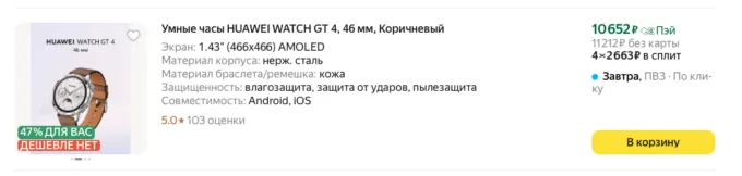 Люди, которые тогда приобрели эти часы, наверняка довольны покупкой. Но ещё больше кайфа от покупки получат покупатели, которые приобретут устройство на распродаже 11.11. Мы заметили, что сейчас на Маркете часы Watch GT 4 можно взять минимум за 10 652 рубля. Такая цена на момент написания заметки актуальна прежде всего при выборе Москвы и других крупных городов в качестве региона доставки, но предложение может быть действовать и в других населённых пунктах.