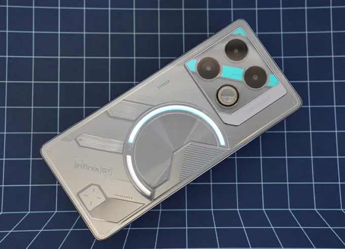 Возможно, один из самых доступных по-настоящему геймерских смартфонов. Во-первых, Infinix GT 20 Pro выглядит реально футуристично. Тут в арсенале плоские рамки (всё по трендам), рисунки из геометрических фигур и, конечно же, подсветка, без неё ведь просто никак.