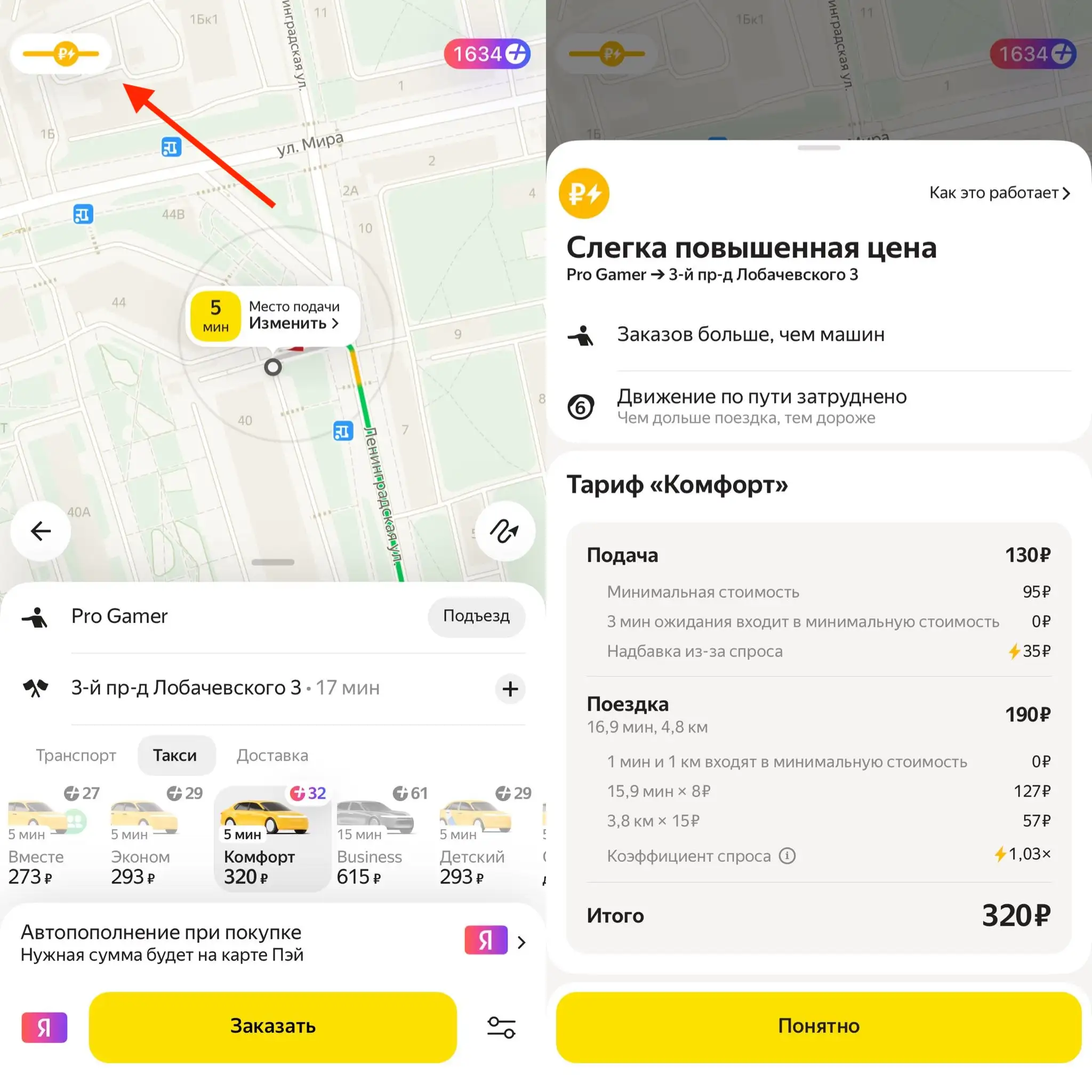 Открываем приложение «Яндекс Go», вводим адрес назначения и нажимаем на индикатор спроса в левом верхнем углу экрана. Откроется окно, в котором будет написано, почему цена такая высокая — нет машин или на дорогах появились пробки. Также тут будет указана стоимость подачи и конкретные расценки с коэффициентом спроса.