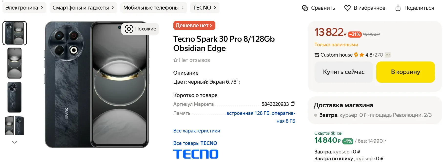 Недавно до России добрался Tecno Spark 30 Pro — приятный бюджетник, появление которого, кажется, никто не заметил. А зря! У этого смартфона все в порядке с характеристиками, а прайс совсем не высокий. Например, сейчас за девайс просят всего 13 820 рублей на Маркете.