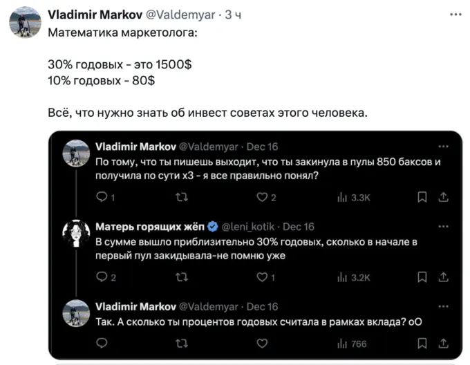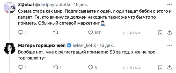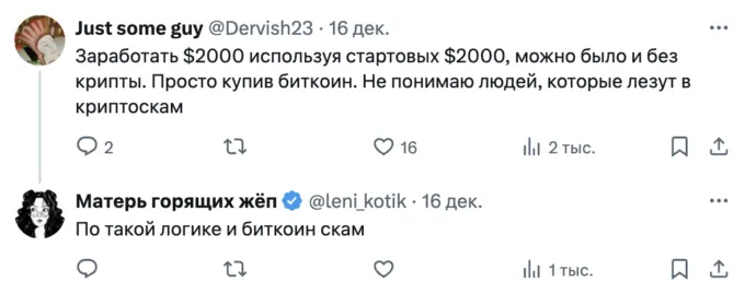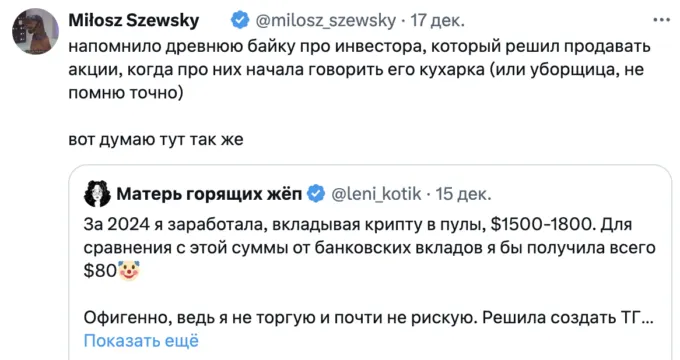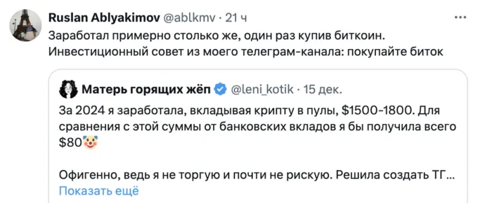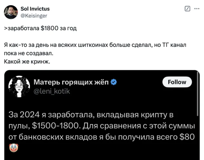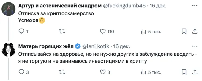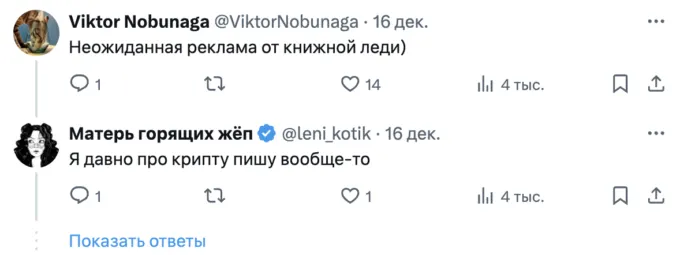 Исследователь поп-культуры и литературный блогер Катя Лазицкая рассказала, что завела канал о криптовалюте и похвасталась своим заработком. Тред собрал 400 тысяч просмотров за три дня и кучу негатива со стороны комментаторов.