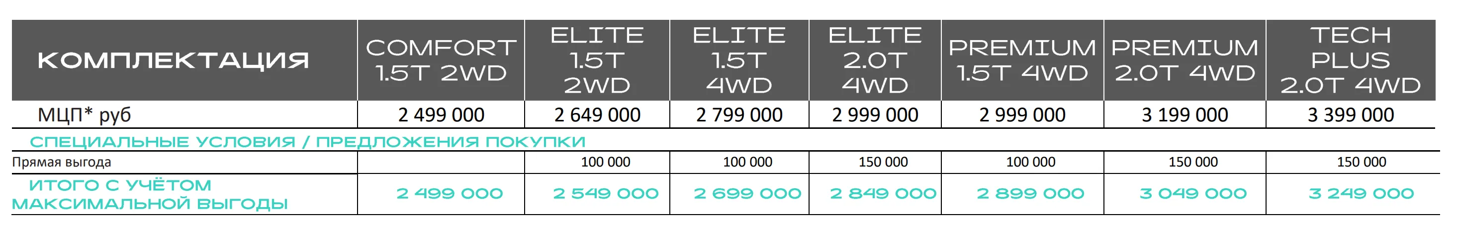 - Haval H3 — 100 000 рублей (2 599 000 рублей)