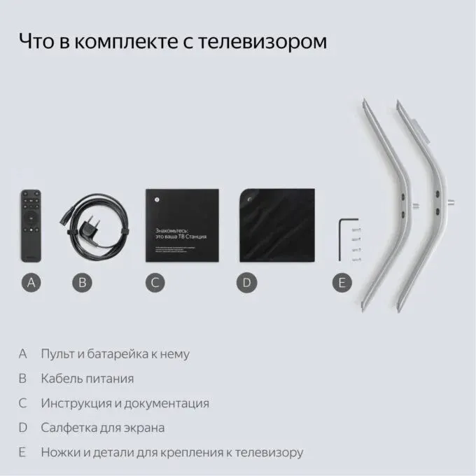 Ещё одна имбовая фича Яндекс ТВ Станции Про — богатая комплектация. В коробке вместе с телевизором вы получаете обычные ножки, пульт, тряпочку для протирки экрана, настенное крепление и трафарет. К нему даже докупать ничего не придётся.