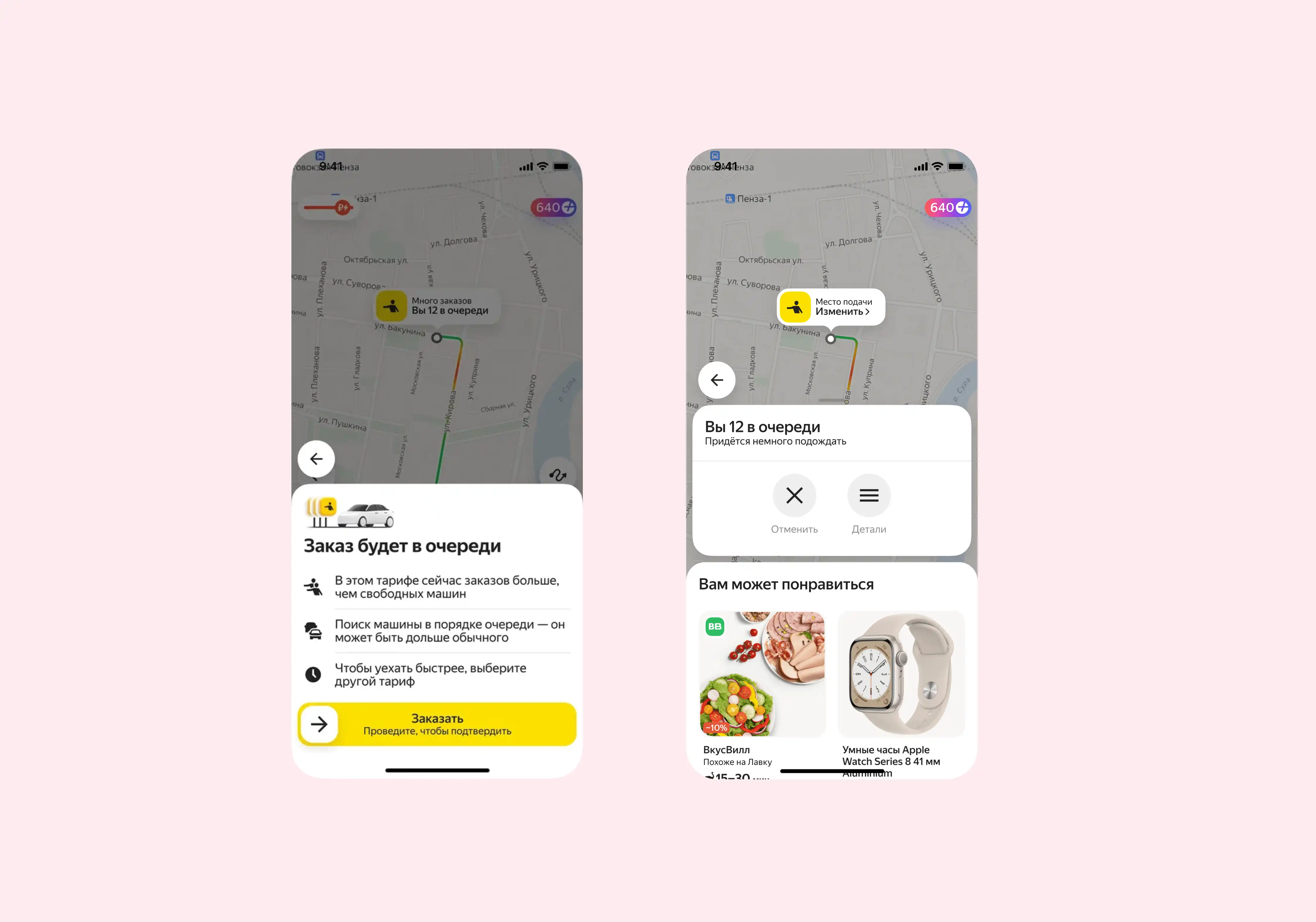 Пользователь может «постоять» в очереди и дождаться своей машины по цене, по которой сделал заказ, или попытаться найти автомобиль в другом тарифе.