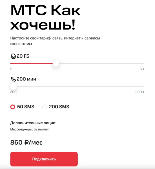 За 800 рублей у МТС есть всего 5 Гбайт трафика и 250 минут — отметаем. Зато в тарифе «Как хочешь!» можно настроить свой пакет: выбираем 20 Гбайт интернета и 200 минут (меньше не взять). Получается 850 рублей в месяц. В пакет еще докладывают 50 SMS и поднимают тариф на 10 рублей.