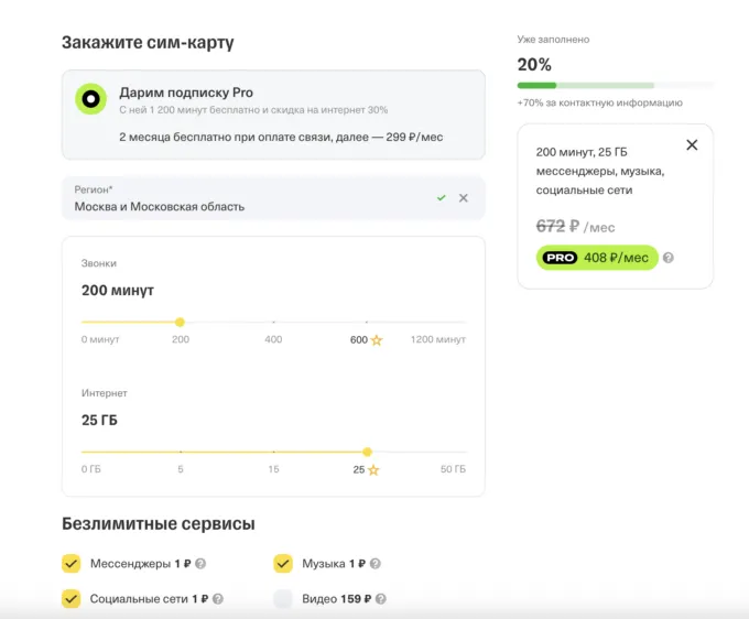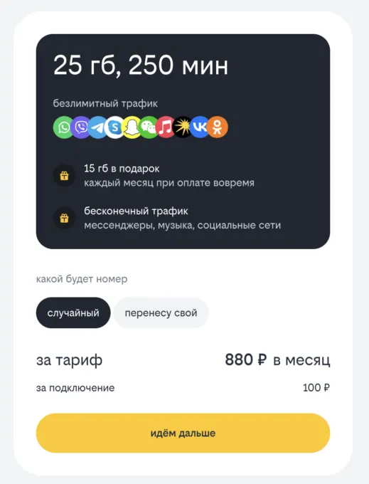 Черно-желтый оператор предлагает собрать свой тариф. Мы выбрали 250 минут (минимальное значение) и 25 Гбайт трафика (опции 20 Гбайт нет) — такой же пакет есть в тарифе «Оптимальный».