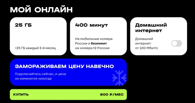 T2 (бывший Tele2) должен оправдывать репутацию дискаунтера, поэтому у него один из самых дешевых тарифов. В базовое предложение по нашим критерями входят 25 Гбайт и 400 минут. Также есть безлимит на Telegram, Viber, WhatsApp, VK, «VK Видео», «VK Клипы», «VK музыку», «Одноклассники».