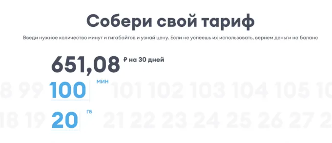 У младшей дочки «Мегафона» нет готовых тарифов (за исключением одного, смотрите на сайте), все нужно собирать через конструктор. Поэтому врубаем строго 20 Гбайт и 100 минут, получая 651 рубль 8 копеек. Также в тарифе не нужно платить за трафик в Telegram, Viber, WhatsApp и китайских мессенджерах WeChat и imo.