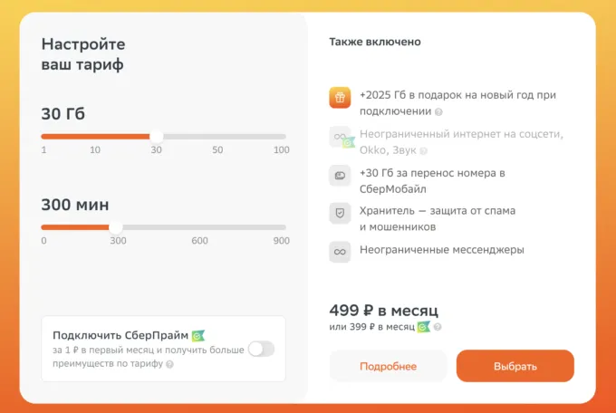 У виртуального оператора Сбера, к сожалению, «широкий шаг» при настройке пакета: доступны 0 или 300 минут и 10 или 30 Гбайт. Мы взяли 300 минут и 30 Гбайт, получив за это предоплатный тариф за 499 рублей в месяц.