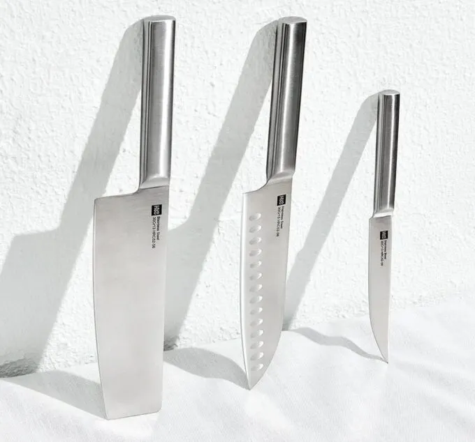 Чтобы не попасть в такую ситуацию, лучше заранее обзавестись качественным сетом от Xiaomi. Народный бренд предлагает качественное и доступное решение в виде набора стальных ножей HuoHou с фирменной подставкой. Причём стоит весь комплект совсем недорого.