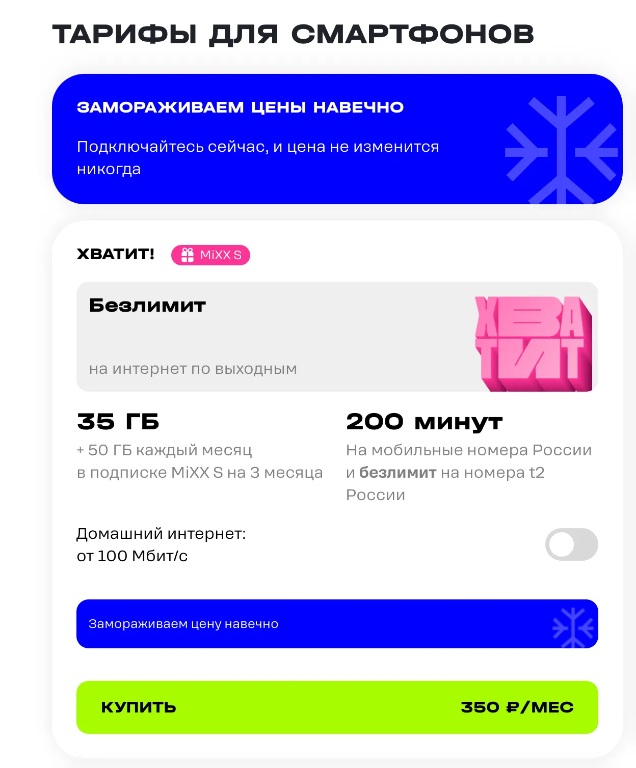 Абонентам — своим и других операторов — T2 предложил перейти на новые тарифы и получить возможность «навечно» заморозить стоимость услуг. Ранее оператор предлагал заморозку на 1 или 2 года, и эта идея, по словам T2, понравилась пользователям.