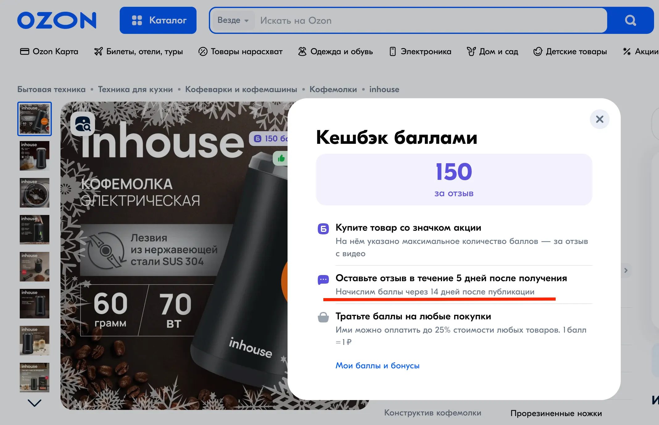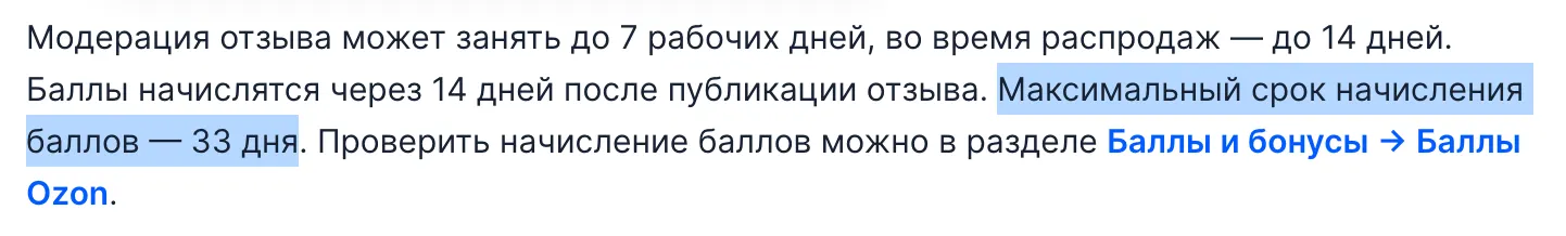 Раньше Ozon начислял баллы моментально, затем сроки увеличили до 14 дней. Кстати, об этом говорится на странице любого товара, который участвует в акции.