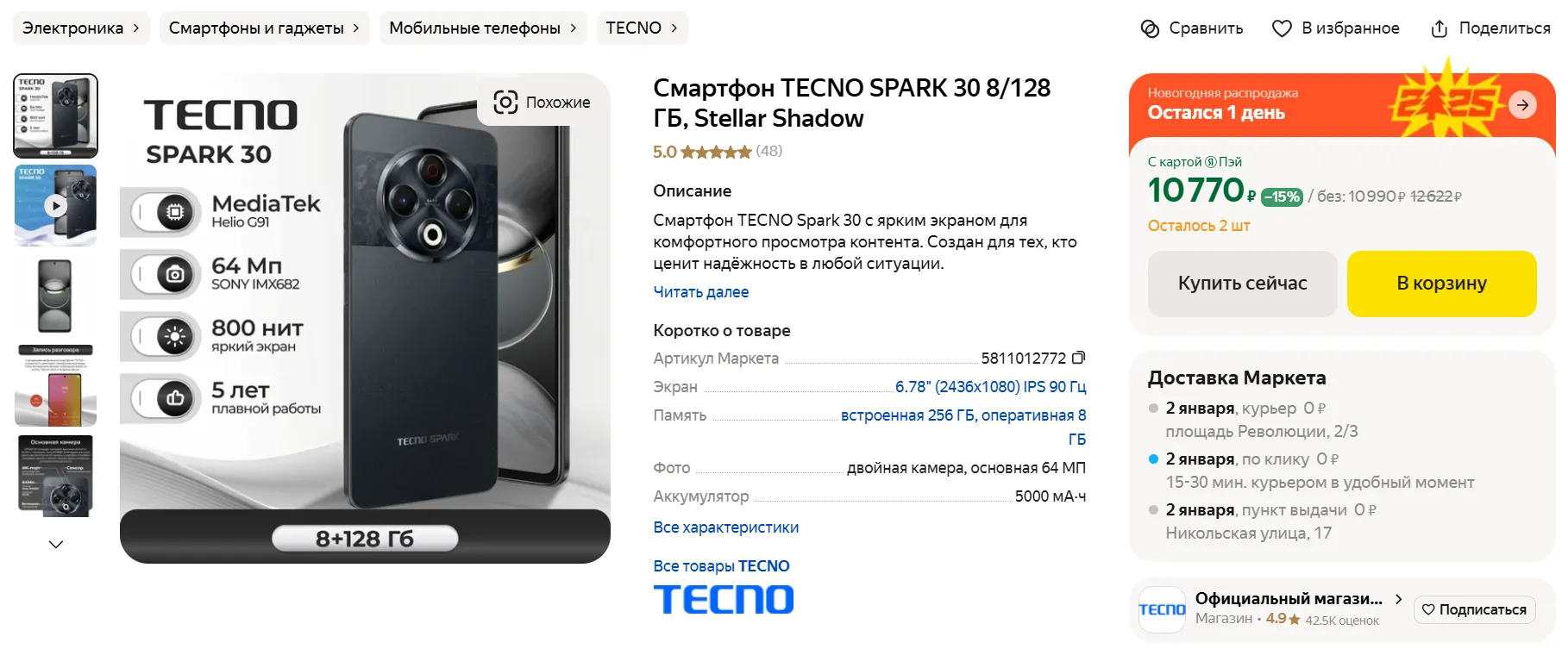 Если на эти нюансы вам плевать, смело хватайте Tecno Spark 30: на Маркете за него просят всего 10 990 рублей. Отличный прайс — надо брать, пока цену не подняли.