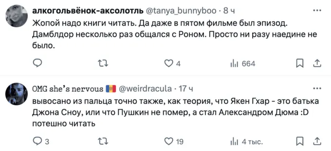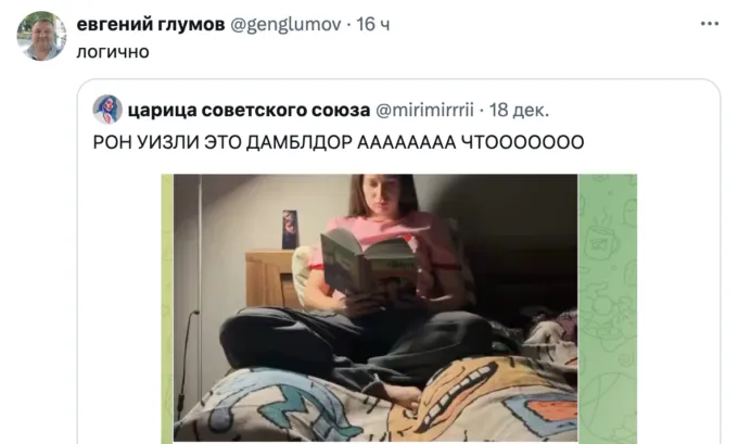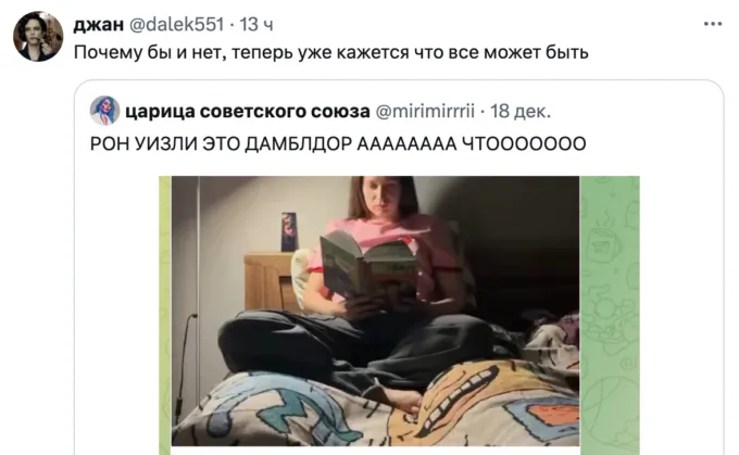 Книги и фильмы по «Гарри Поттеру» — настолько великое явление поп-культуры, что франшизу обсуждают до сих пор. Пользовательница твиттера под ником @mirimirrrii подсветила фанатскую теорию, согласно которой один из героев серии Рон Уизли является профессором Альбусом Дамблдором.