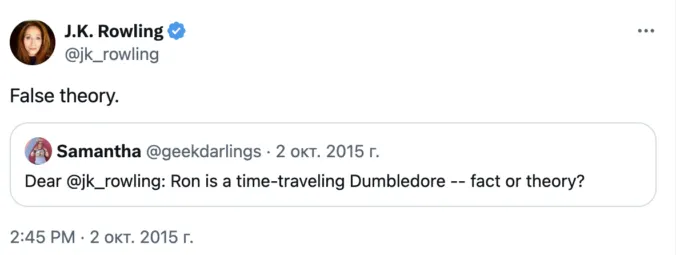 Точку в споре уже поставили, и это сделала сама создательница «поттерианы» Джоан Роулинг. В 2015 году она написала в твиттере, что теория — чушь.