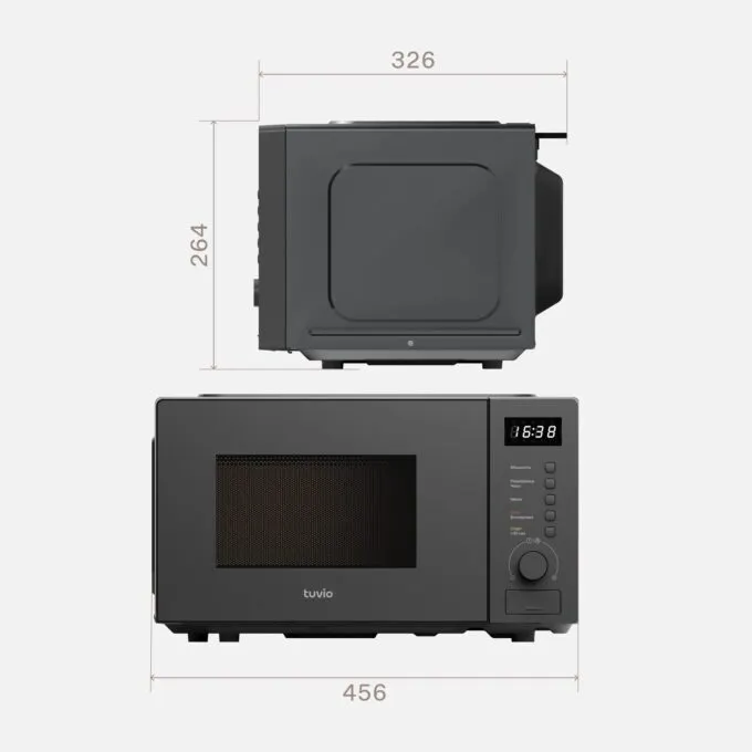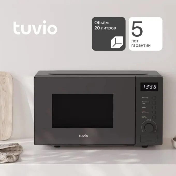 Производитель предусмотрел 8 автоматических программ, которые позволяют готовить мясо, рыбу, овощи и даже выпечку. Ещё пара плюсов Tuvio MW03GB — функция «Быстрый старт», блокировка от случайных нажатий и антипригарное покрытие камеры.
