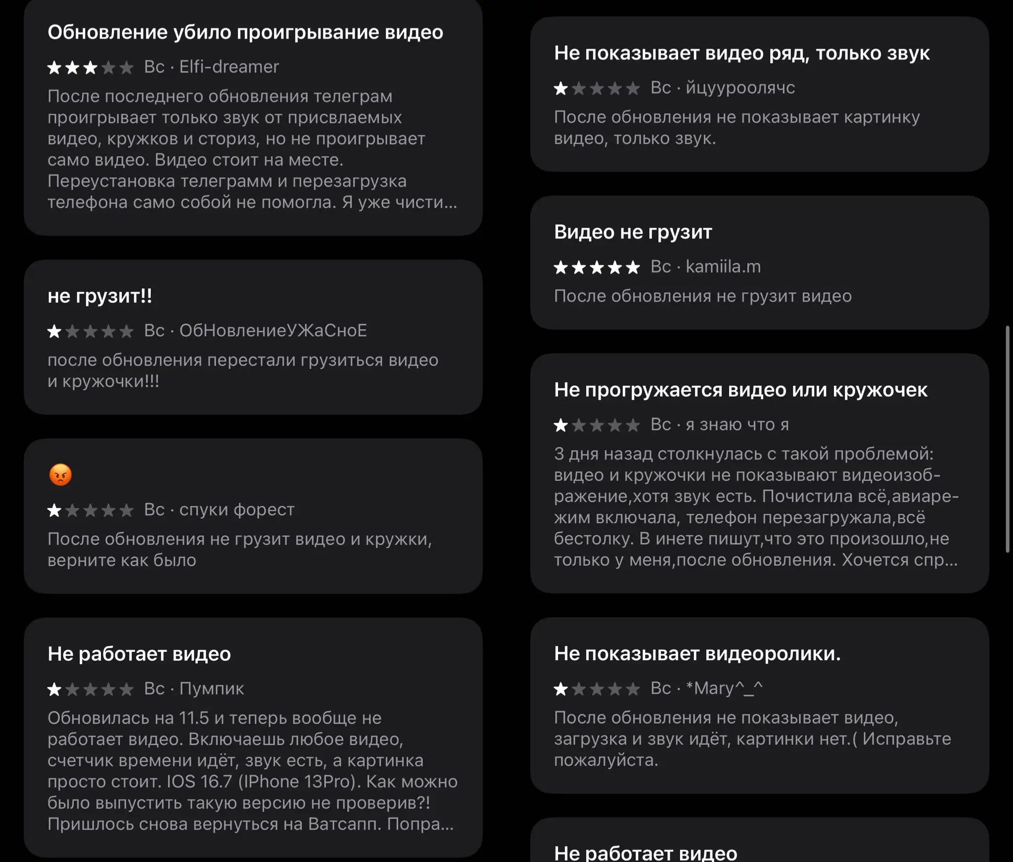 Спустя время после выхода обновления 11.5 страницу мессенджера в App Store завалили гневными отзывами. Пользователи жалуются, что время от времени видео перестают проигрываться — картинка просто зависает на месте, а звук идет. Отчасти можно решить проблему, поигравшись с ползунком, да и то не всегда.