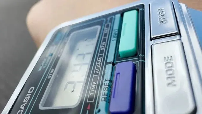 Корпус в этих часиках Casio Vintage сделан из качественного пластика, который со временем точно не рассыпется. Однако небольшой нюанс в виде хромированного безеля стоит учитывать — он неплохо собирает царапины. Зато ремешок — добротный. Он отлит из нержавеющей стали. Дисплей в этой модели выглядит немного мелким, но он выводит только самую нужную информацию. Под ним расположены две цветные кнопки, которые активируют подсветку и сбрасывают таймер. Другие две кнопки запускают меню и секундомер. Они уже окрашены в цвет корпуса.