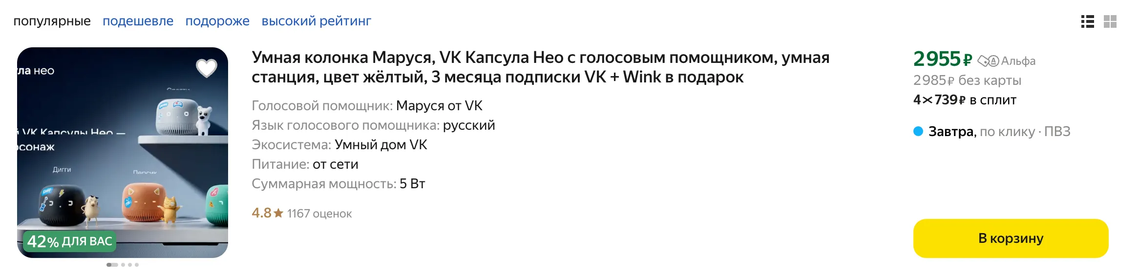 Что-то произошло, и «Капсула Мини» подорожала почти в два раза. Зато приятно упала цена на стартовую колонку от VK с часами и приличным звуком для прослушивания подкастов и аудиокниг.