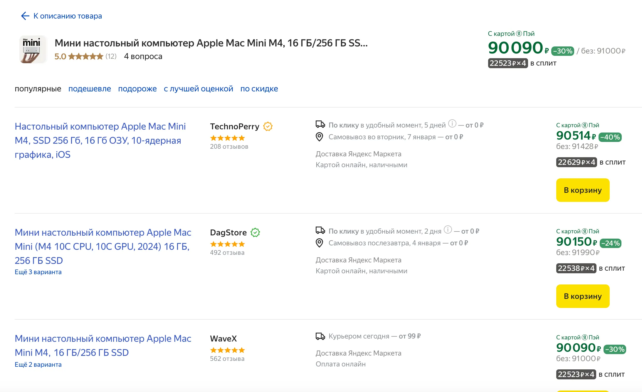 - Mac mini M4 (16/256 Гбайт) — 90 090 рублей, прошлый месяц — 99 800 рублей