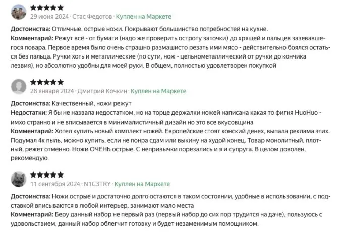 Все ножи этой модели изготовлены из нержавеющей стали 50Cr15MoV, усиленной хромом, молибденом и ванадием. Для чего это надо? Такая комбинация делает их не только прочными, но и устойчивыми к коррозии. Все лезвия затачивают под углом 13°, что обеспечивает исключительную остроту. Даже по отзывам владельцев на Маркете можно сделать вывод, что ножи сохраняют заточку значительно дольше, чем рандомные турецкие ножи из «Пятёрочки».