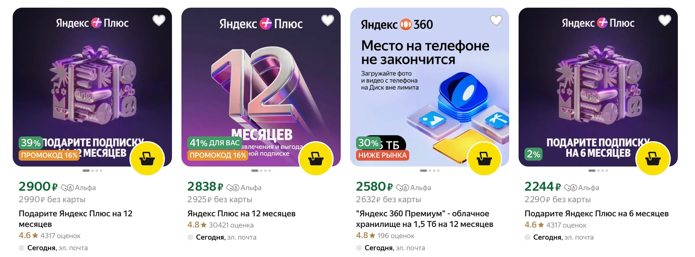 • Покупать на Маркете или других маркетплейсах. Чем больше месяцев берете, тем выгоднее будет подписка. Например, на Маркете 1 месяц стоит около 390 рублей, целый год — 2800-2900 рублей. При покупке оптом получается около 240 рублей за 1 месяц.