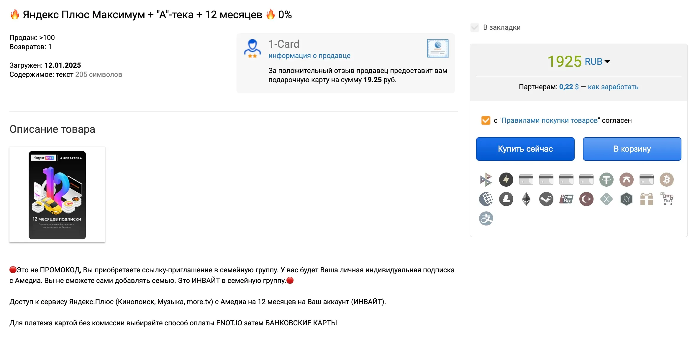 • Покупать промокоды у перекупщиков. В интернете есть много площадок, где барыжат промокодами, полученными разными способами — типа Плати.ру. Кроме обычной подписки, которая имеет плюс-минус рыночную стоимость, можно купить приглашение в семью. То есть кто-то оплатил подписку на долгий срок и пригласил вас к себе за доплату.